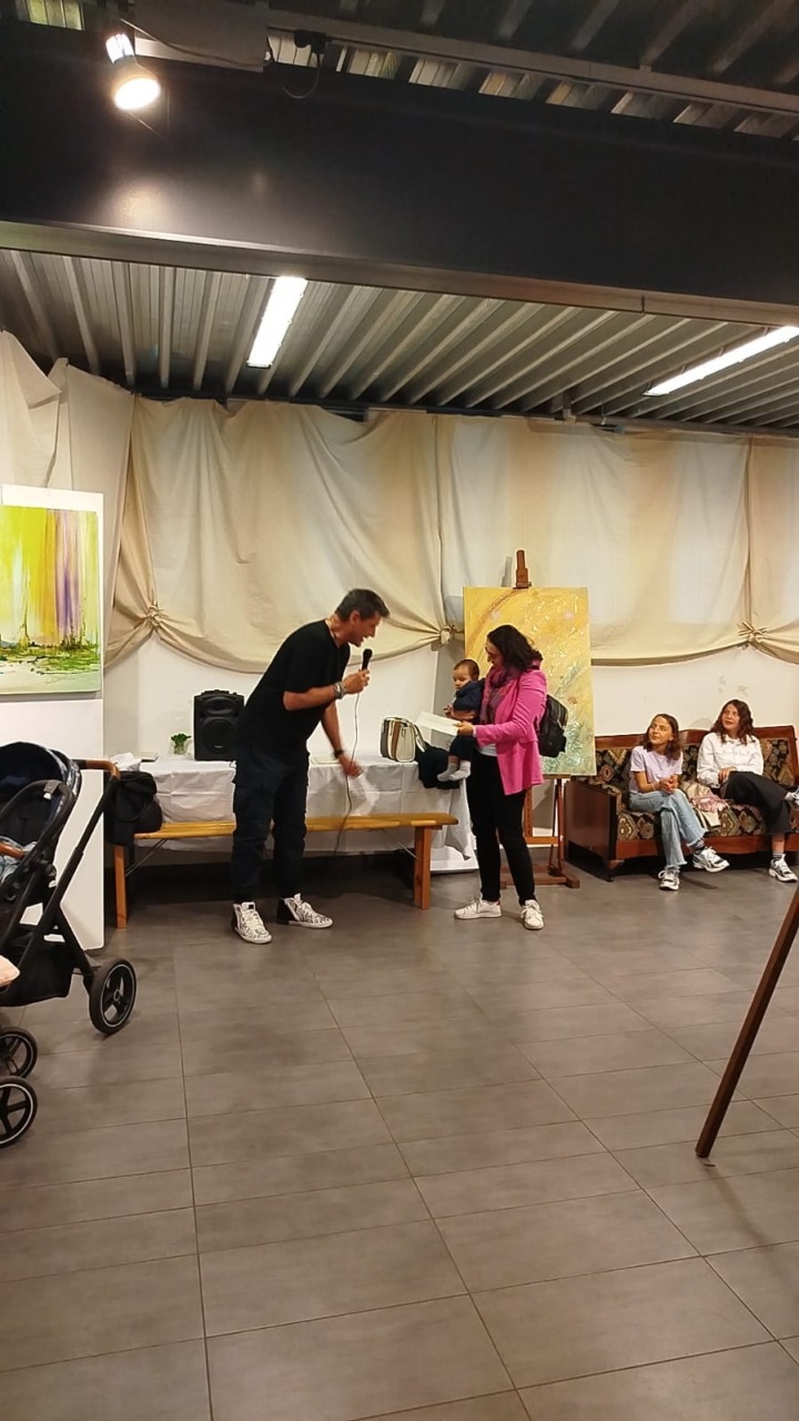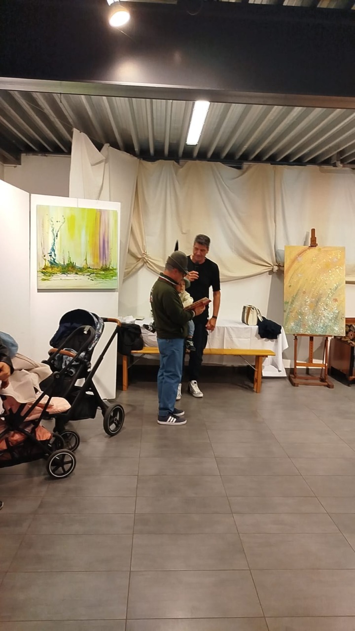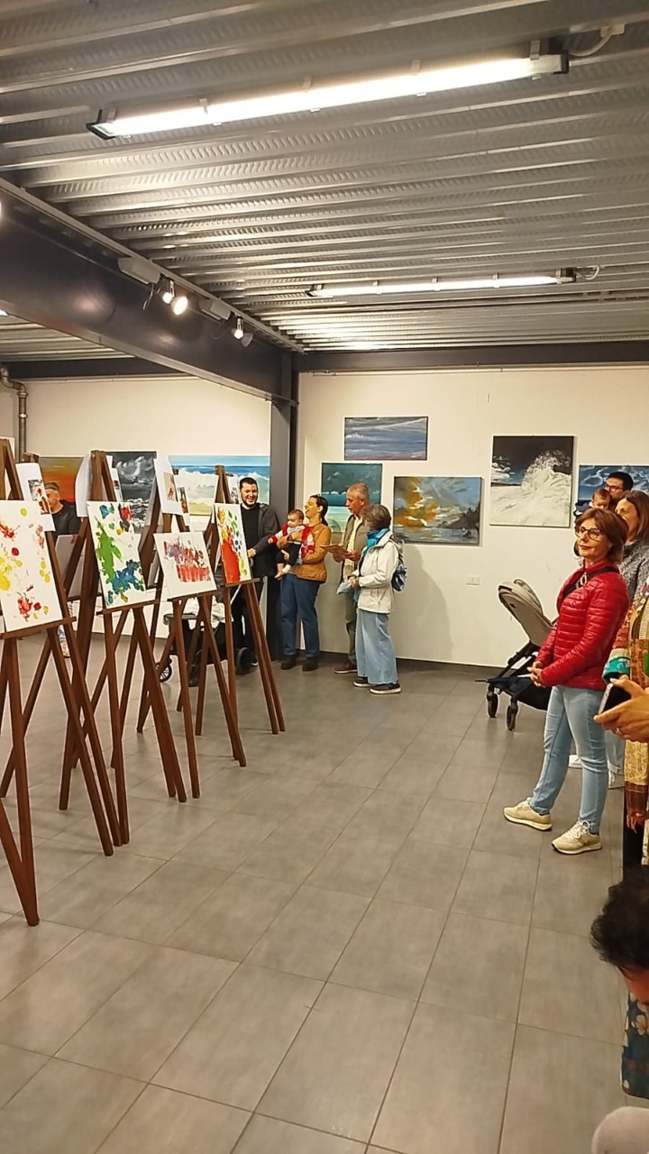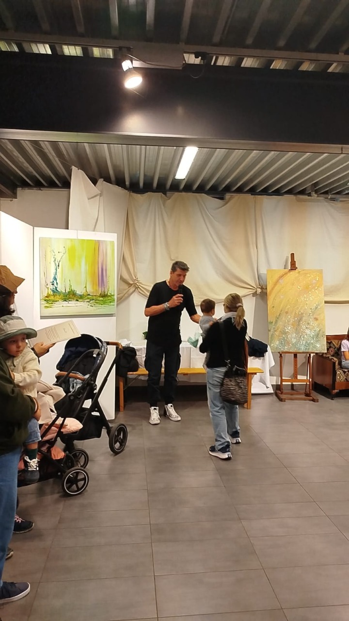 “È stata un’emozione unica – aggiunge il maestro –. Siamo riusciti a coinvolgere dieci bambini dai nove mesi ai tre anni. Vederli dipingere con i loro piedini è stato fantastico. Le loro tele sono state esposte accanto alle mie, creando un giro tondo artistico speciale.”